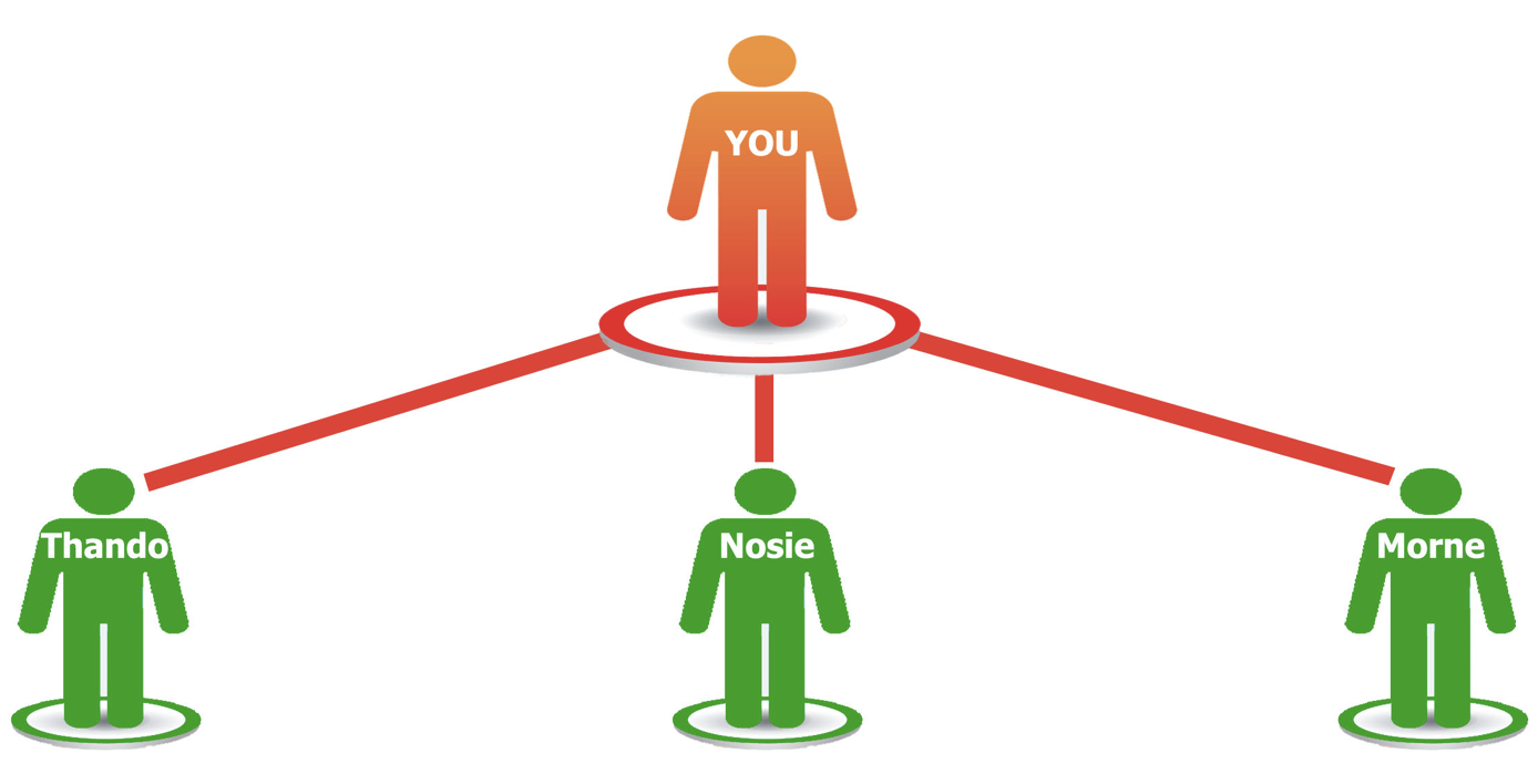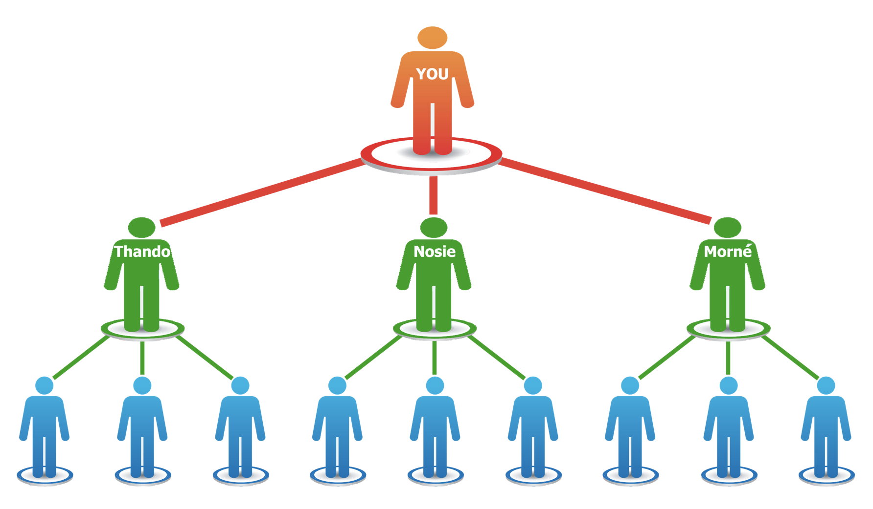 This is referred to as your Level 2, but it will be level one for Thando, Nosie and Morne. Just like you, the three will be incentivised on a monthly basis for their referrals. However, since you personally referred Thando, Nosie and Morné, the system will still pay you the same amount you received earlier per person for the nine people referred by the people under you. This is because the system acknowledges that you are their indirect up-line (see digram below). The system only allows you a maximum of nine (9) people on Level 2.