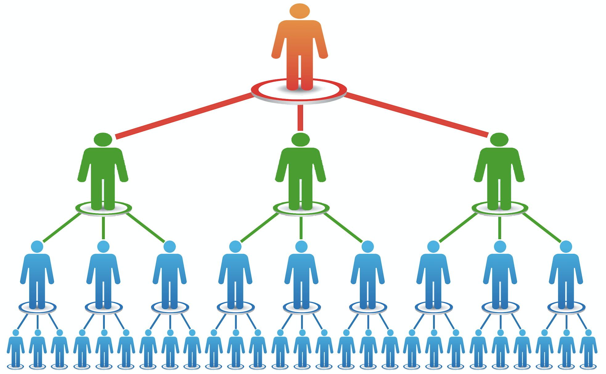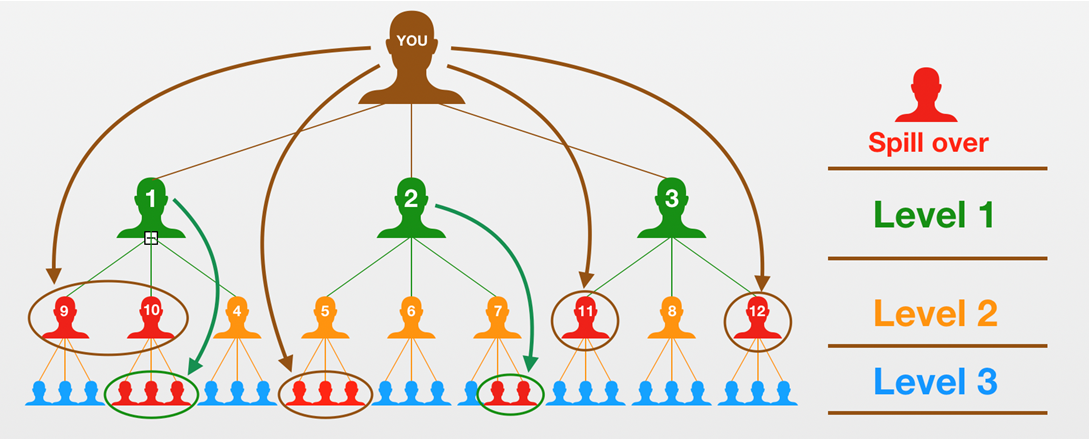 In the diagram, all the red individuals are spill-overs from up-lines of the different marketers. Person 1 only successfully marketed iGen to person 4, but also received persons 9 and 10 from you as his up-line. This means that you, as the up-line, referred more people than the 3 expected on your level 1. It will continue for as long as those above you keep referring people who end up registering to support iGen and make their monthly donations.