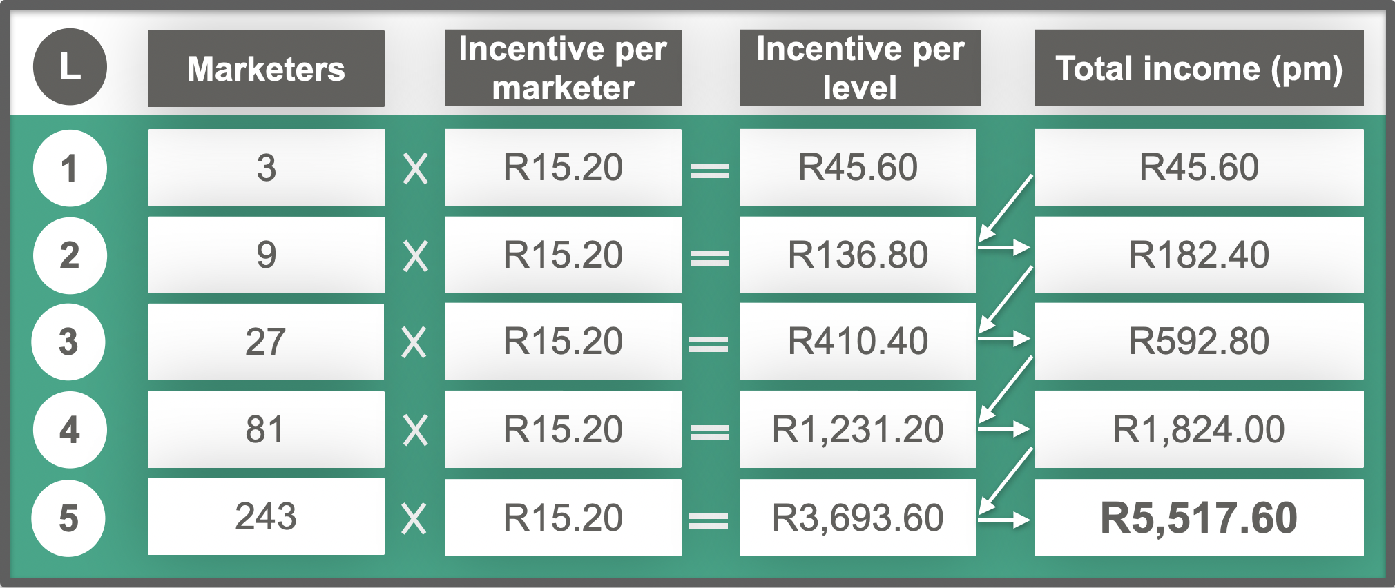 For the R5,000.00 donation option, you will be paid R152.00 per person per month from level one to five for each person who is in your network. In cases where a downline or a spill-over contributes less than R5000 per month, i.e. R3000, you will be paid according to the donation option of that person (R91.20 per person per month).The algorithm changes from level 6-10. See the table below (only levels 1-5) indicating what you are likely to receive, assuming each person in your network will be contributing R5,000 per month. The calculation would be straightforward if the amounts remained at R5,000 throughout the donation period. However, that is less likely to happen as amounts will continuously vary due to the individual amounts which members of your team may choose to donate as well as the built-in automatic upgrade facility.