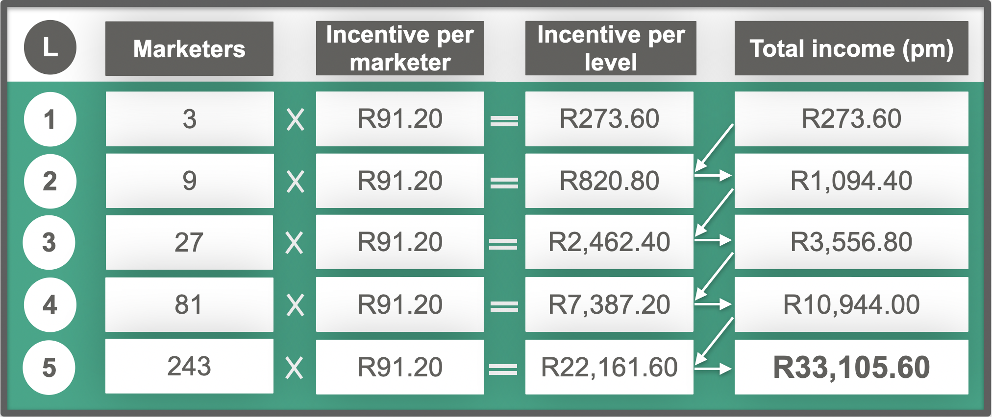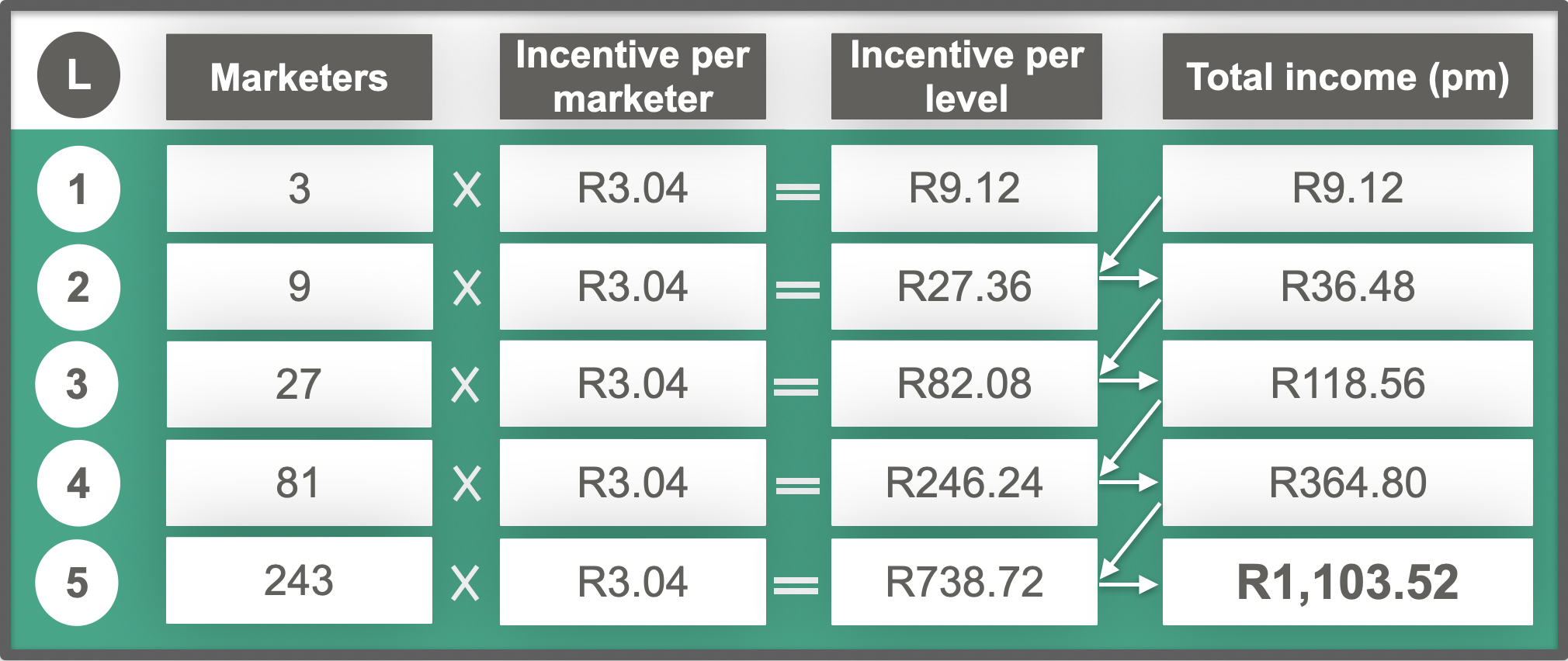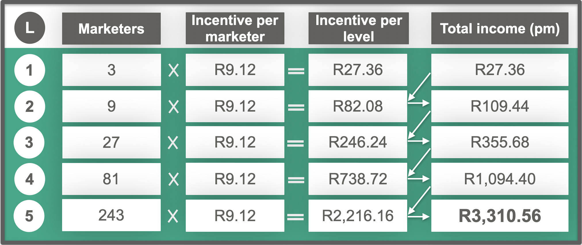 For the R3,000.00 donation option, you will be paid R91.20 per person per month from level one to five for each person who is in your network. In cases where a downline or a spill-over contributes less than R3000 per month, i.e. R1500, you will be paid according to the donation option of that person (R45.60 per person per month). In cases where your downline or spill-over contributes more than R3000 you will be remunerated at the level of your donation, i.e. R91.20 per person per month.The algorithm changes from level 6-10. See the table below (only levels 1-5) indicating what you are likely to receive, assuming each person in your network will be contributing R3,000 per month. The calculation would be straightforward if the amounts remained at R3,000 throughout the donation period. However, that is less likely to happen as amounts will continuously vary due to the individual amounts which members of your team may choose to donate as well as the built-in automatic upgrade facility.